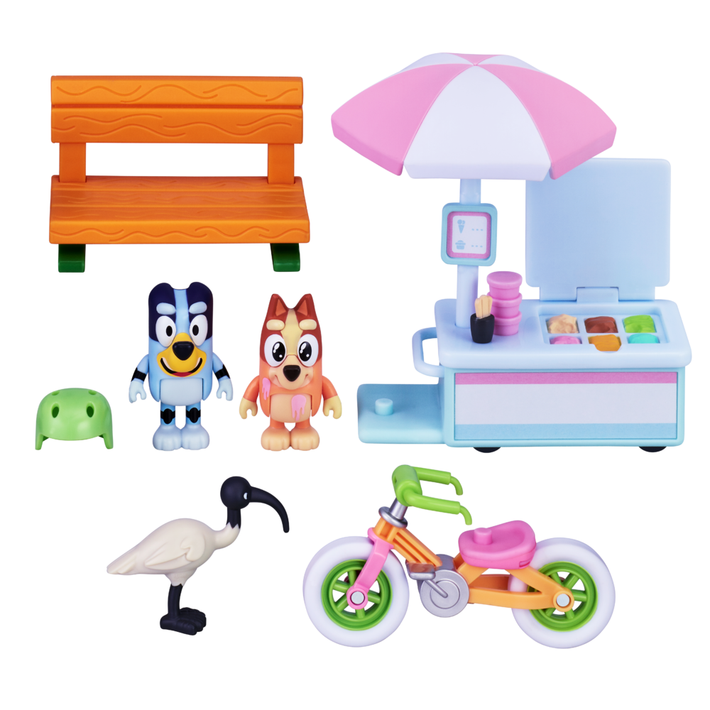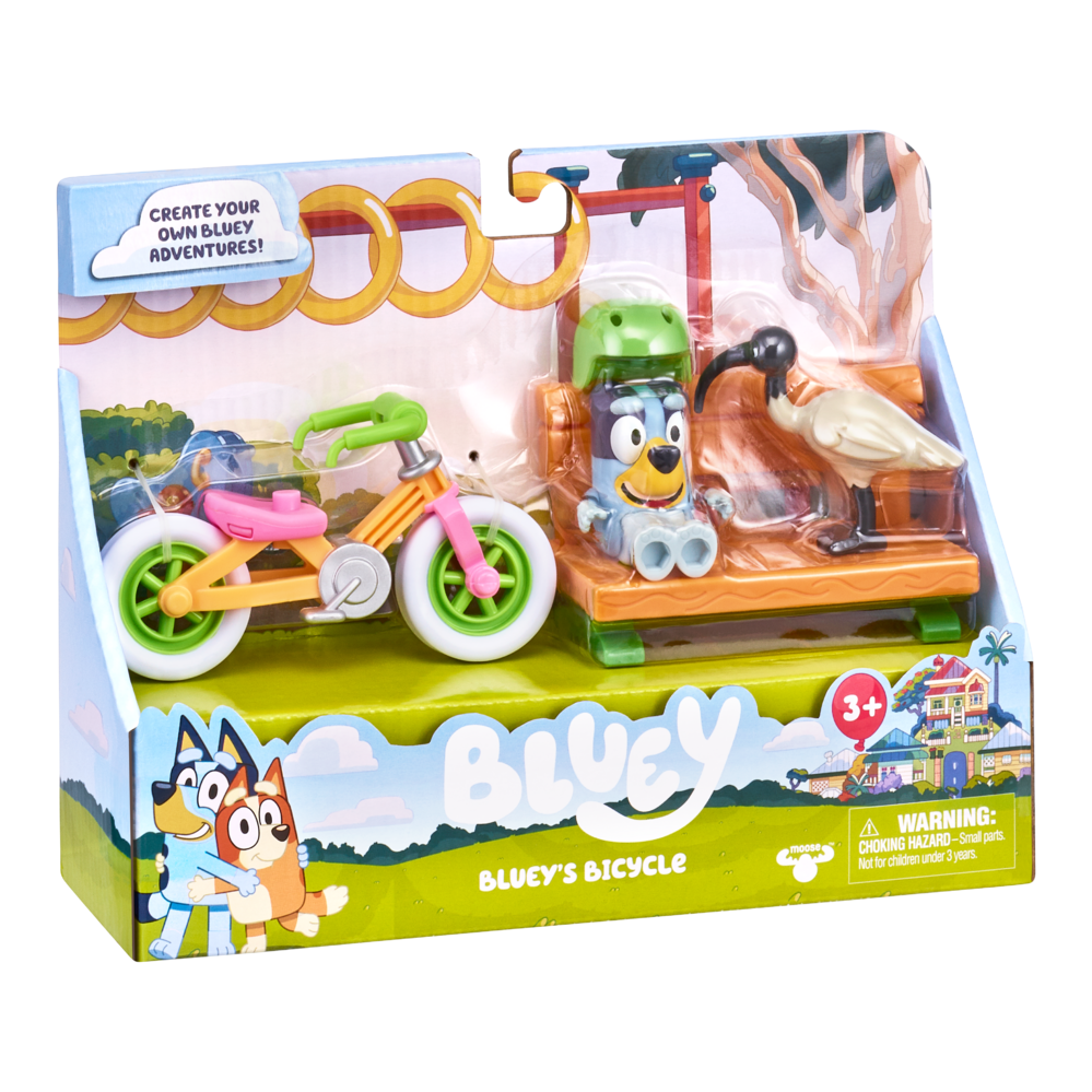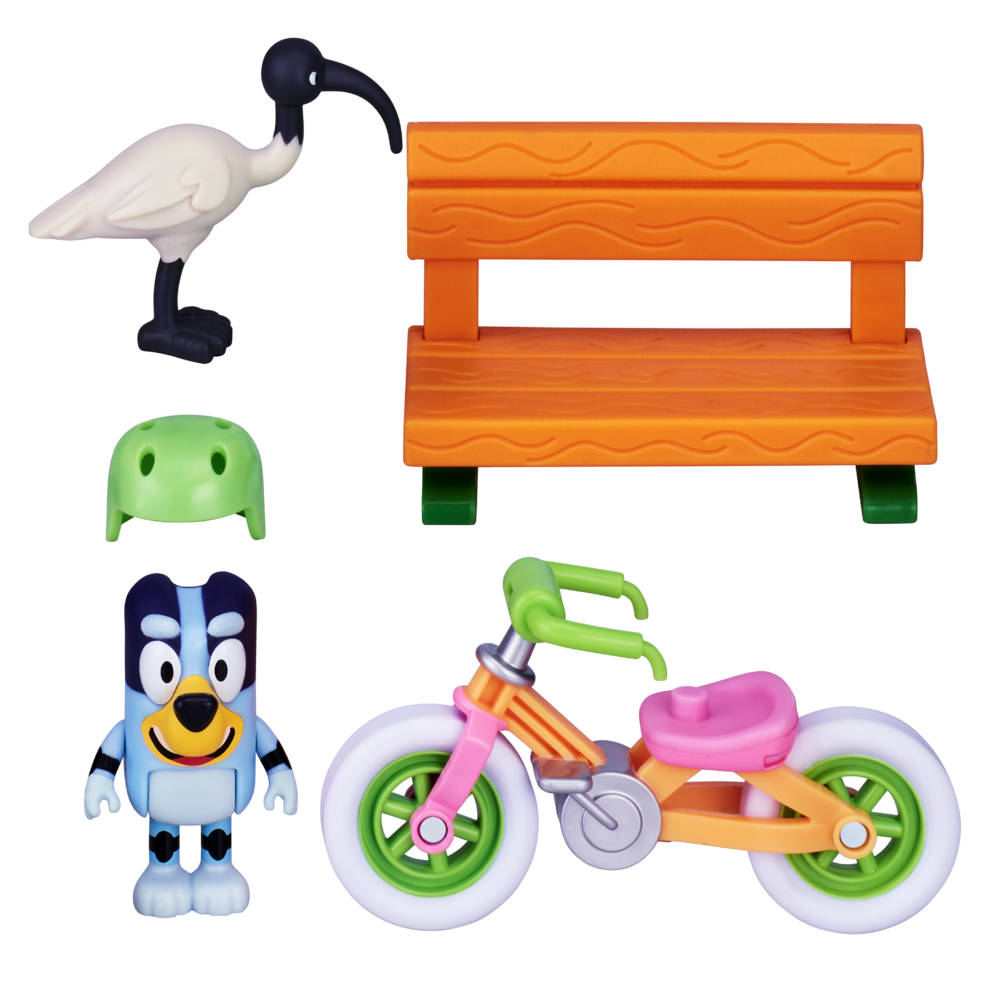 Includes:Â 1 x Bluey Figurine, 1 x Bicycle, 1 x Helmet, 1 x Park Bench and 1 x Bin Chicken.
