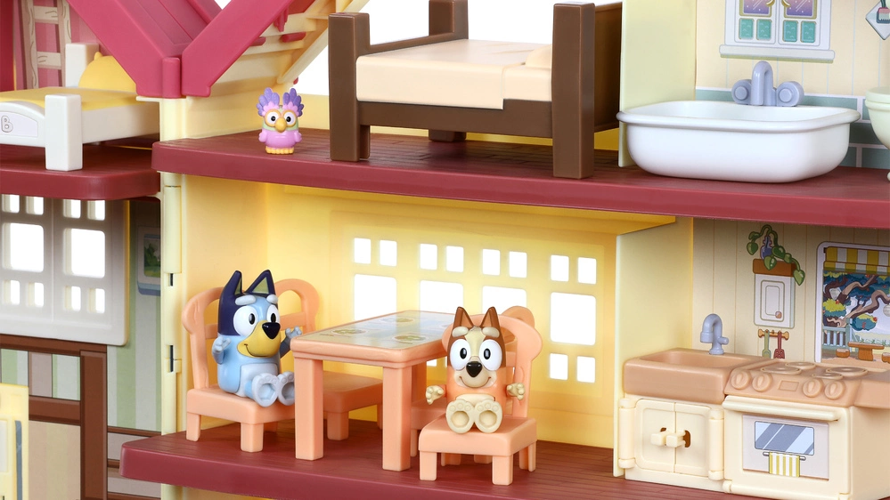 The Bluey Ultimate Lights & Sounds Playhouse is huge at a whopping 43cm tall and 76cm wide when you open it up! Feature-packed, this Playset comes fully furnished with the same furniture seen on the TV show! There are three stories to explore. Bluey’s House comes to life when you press the Octopus in the kid’s room to activate lights and over 50 sounds and phrases! There is even a moving Dancefloor! Attach your Figures and move the Lever to recreate the opening dance scene of the show! The Bluey Ultimate Lights & Sounds Playhouse includes 6.5cm and 7.5cm Figures of Bingo and Bluey plus Chattermax! When you’re finished for the day, pack in the 15 accessories and fold it all away!