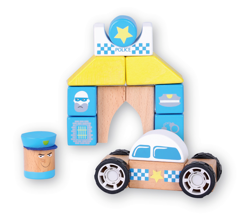 Great for pretend and imaginative play, this 19 piece wooden Police construction set will bring hours of open ended fun play. This set includes blocks that snap together to make a Police Car vehicle and a Police Station, with a police man to man the Police Station.